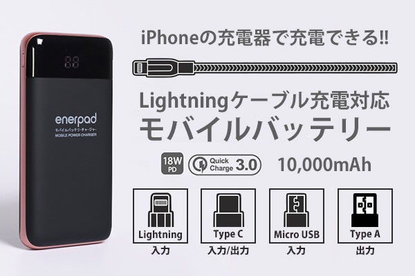 「enerpad Q-910」は、iPhoneの充電器(Lightningケーブル)での充電が可能な、Appleユーザー向けのモバイルバッテリーです。ポケットサイズでありながら10,000mAhの大容量...