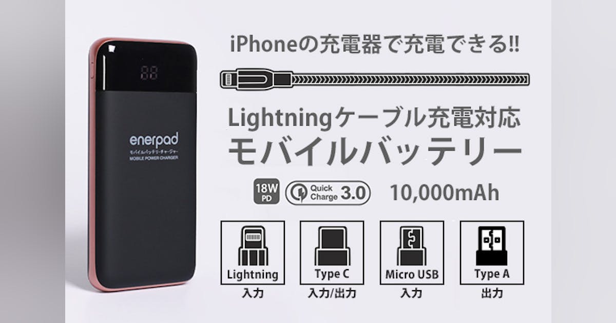 株式会社リンクスインターナショナルは、iPhoneの充電器(Lightningケーブル)で充電できるAppleユーザー向けモバイルバッテリー「enerpad Q-910」をクラウドファンディングに出品しています。