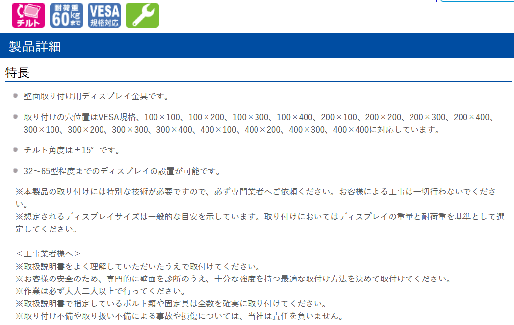 - ※搭載できる画面サイズは一般的な目安を示しています。取り付けにおいてはディスプレイの重量と耐荷重を基準とし選定してください。