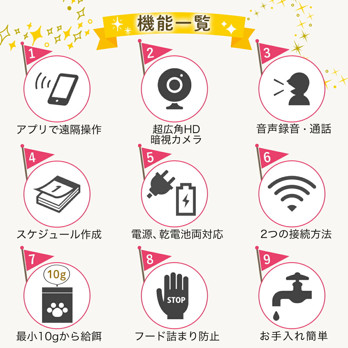 - 給餌ボタンロックやフードタンクロック機能など、いたずら防止機能を多数搭載