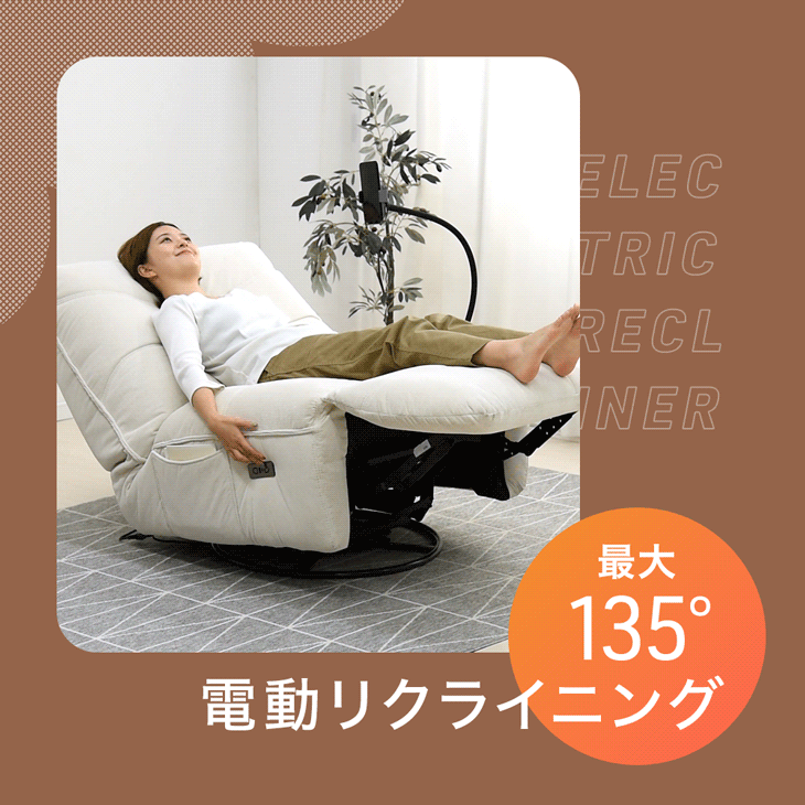 電動リクライニングやロッキングなどの高いリラックス性能に加え、両手が空いた状態でスマホでの動画鑑賞などが楽しめるスマホアームを搭載し、さらにふわふわとした柔らかな印象のデザインを兼ね備えた次世代の電動ソファとなります。