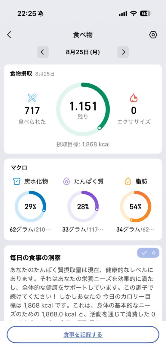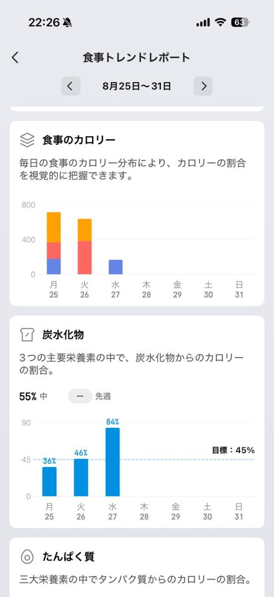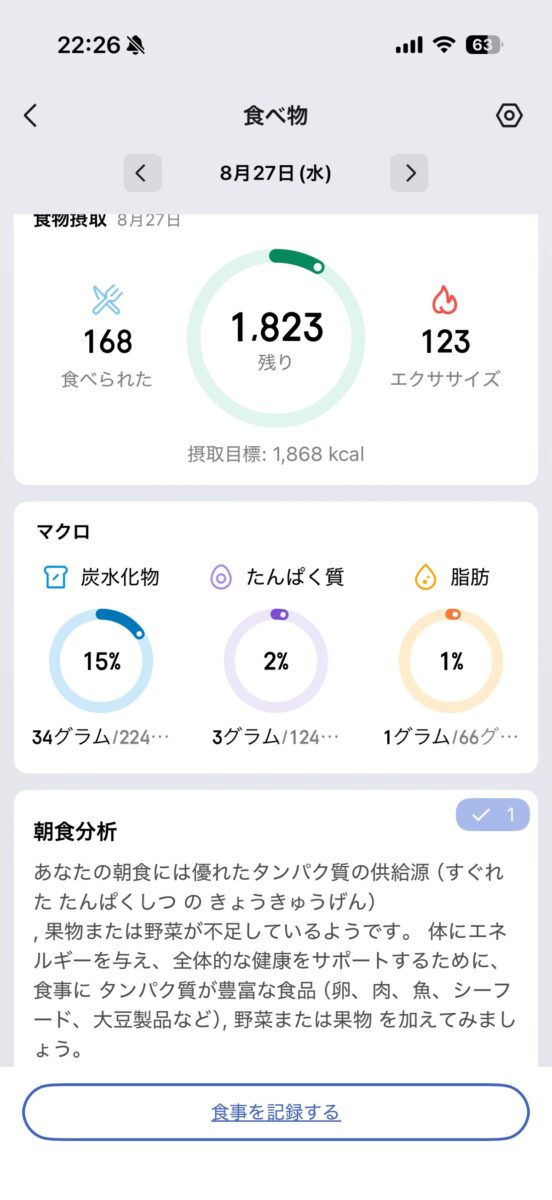食事のレポート機能がアプリにあり、毎回の食事を写真やテキストで登録することで、日々のカロリー管理が行えます。食事のメニューに応じて、炭水化物、タンパク質、脂肪を分類し、食事をバランスよく摂取できるようにアドバイスも表示されます。