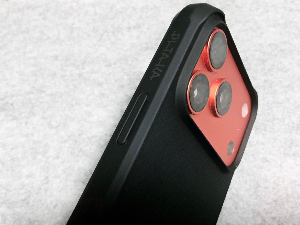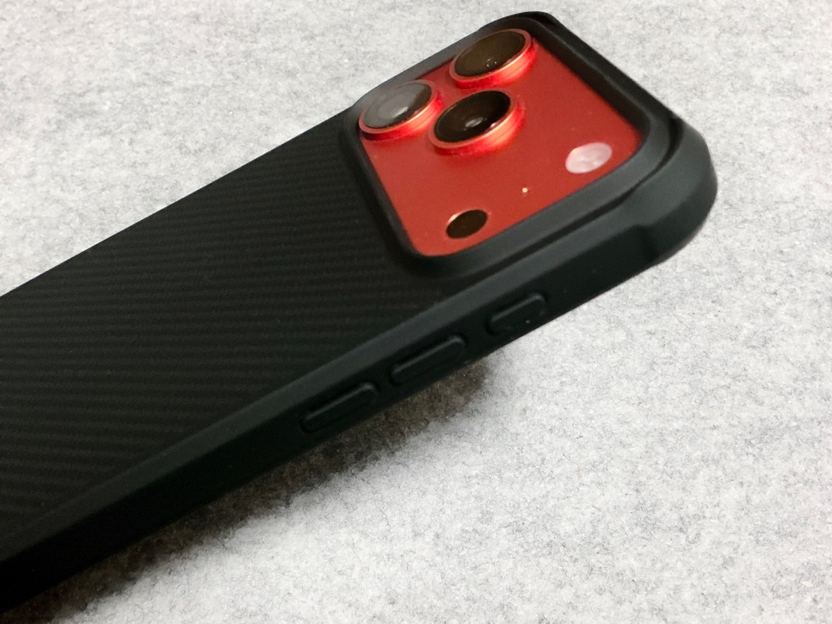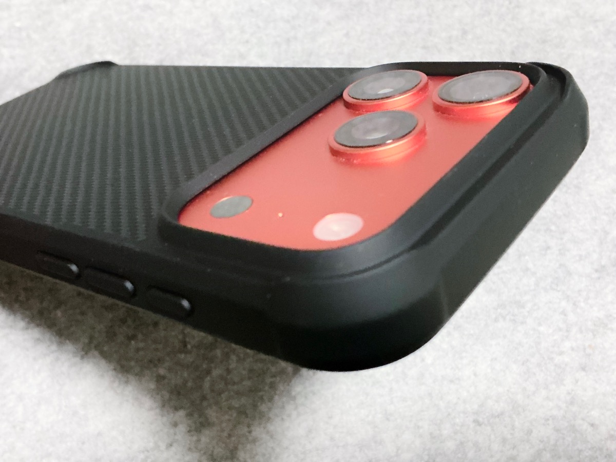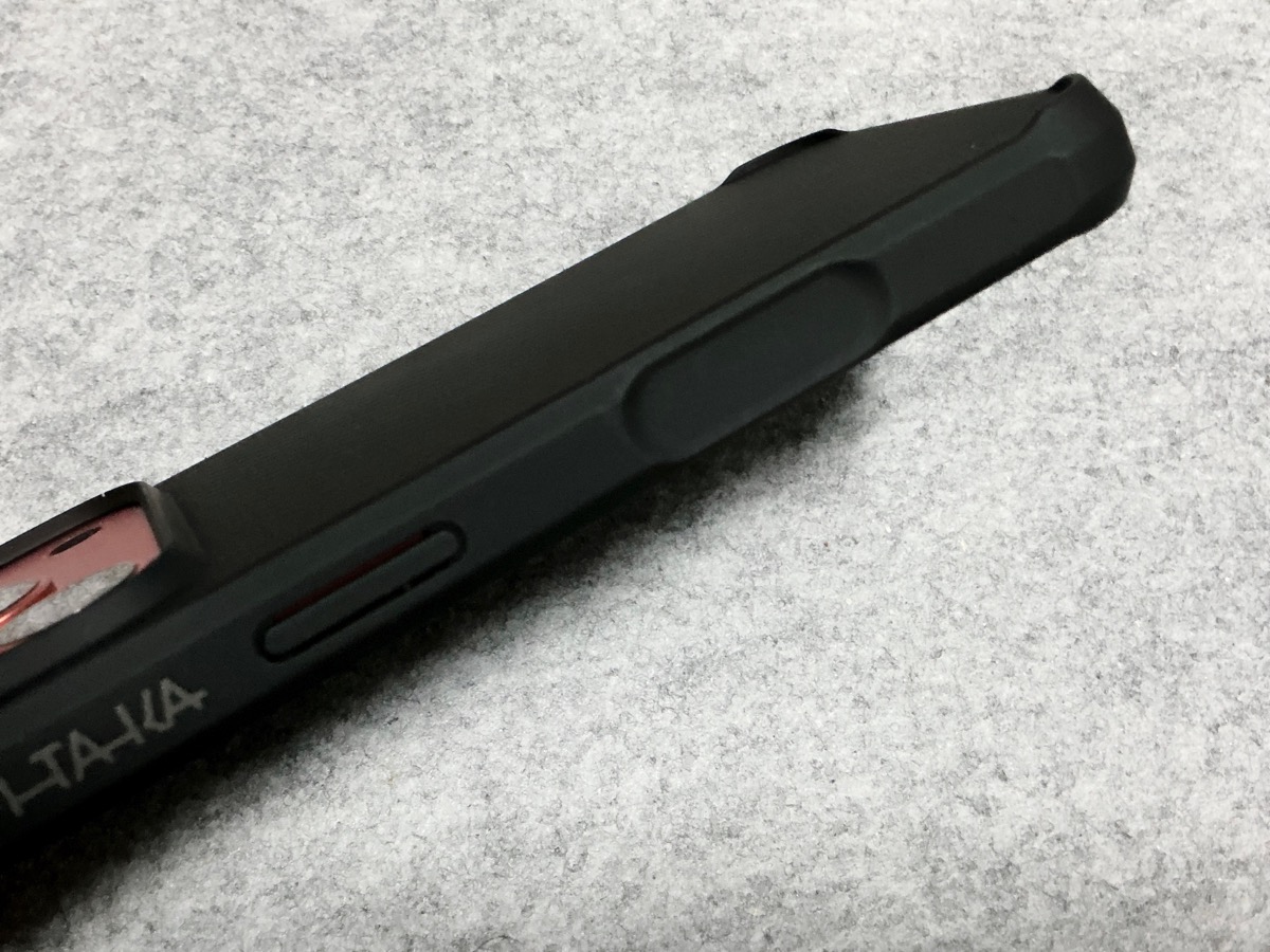 今回は保護機能もしっかりとしており、iPhoneの側面周囲はすべて保護できます。カメラコントロールボタンも保護ができており、使いやすいのですが、カメラユニットは大きく開口しているので、保護ガラス等で保護した上で使うと良いです。