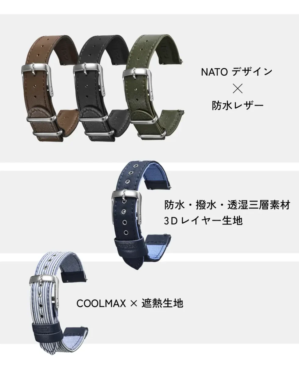「Apple Watch用ストラップで魅力的なNATOタイプが無い!」LOWERCASE梶原由景氏たっての希望で、NATOデザインのストラップを開発しました。素材は防水レザー。Knot定番モデルでも、その機能性から大人気の素材です。