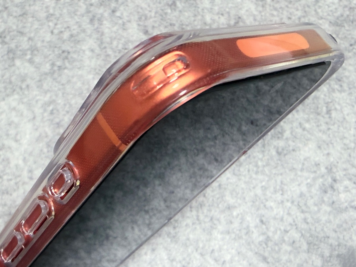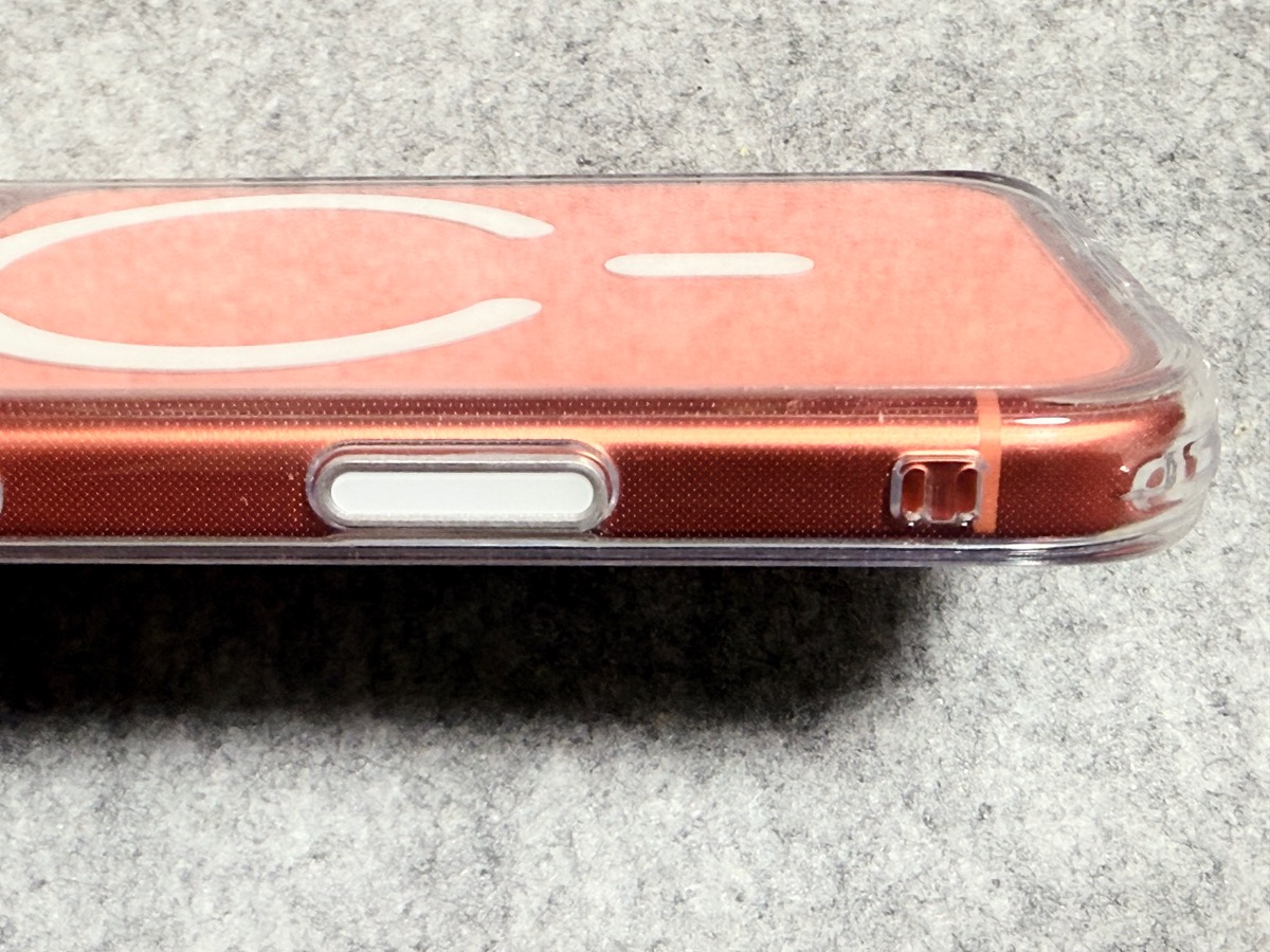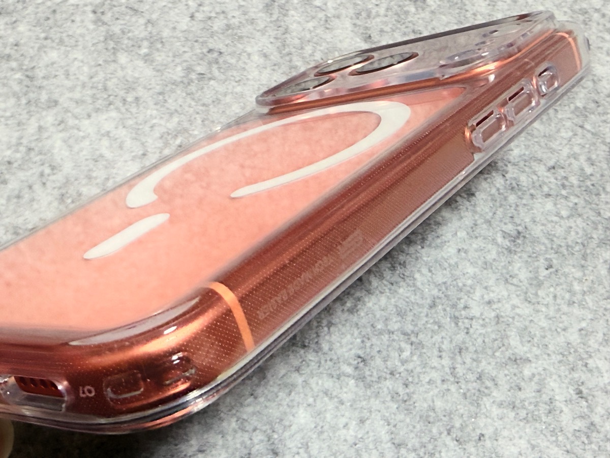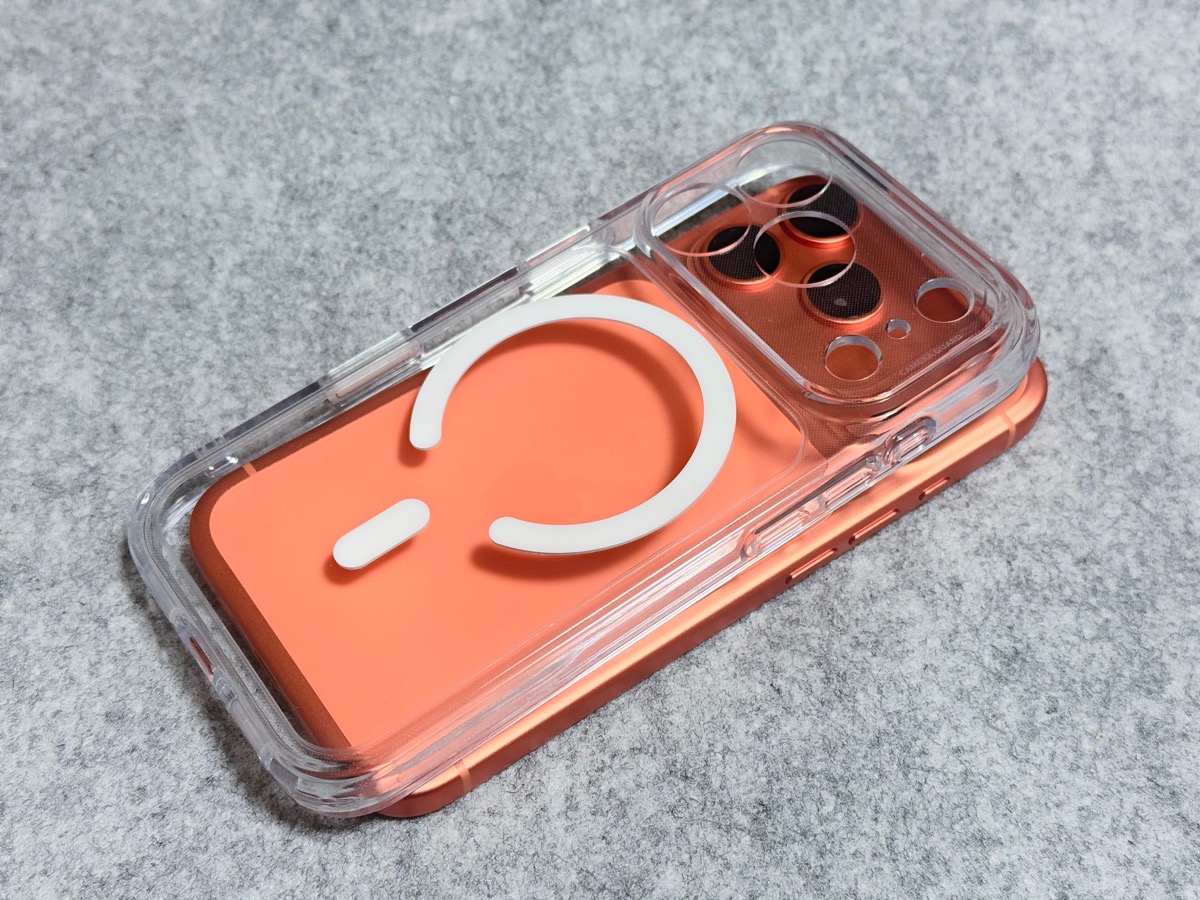 なお、ケースの側面とカメラユニット周辺はTPU素材を採用しており、MagSafe周辺の部分のみ透明ポリカーボネートを採用したハイブリッドケースとなります。