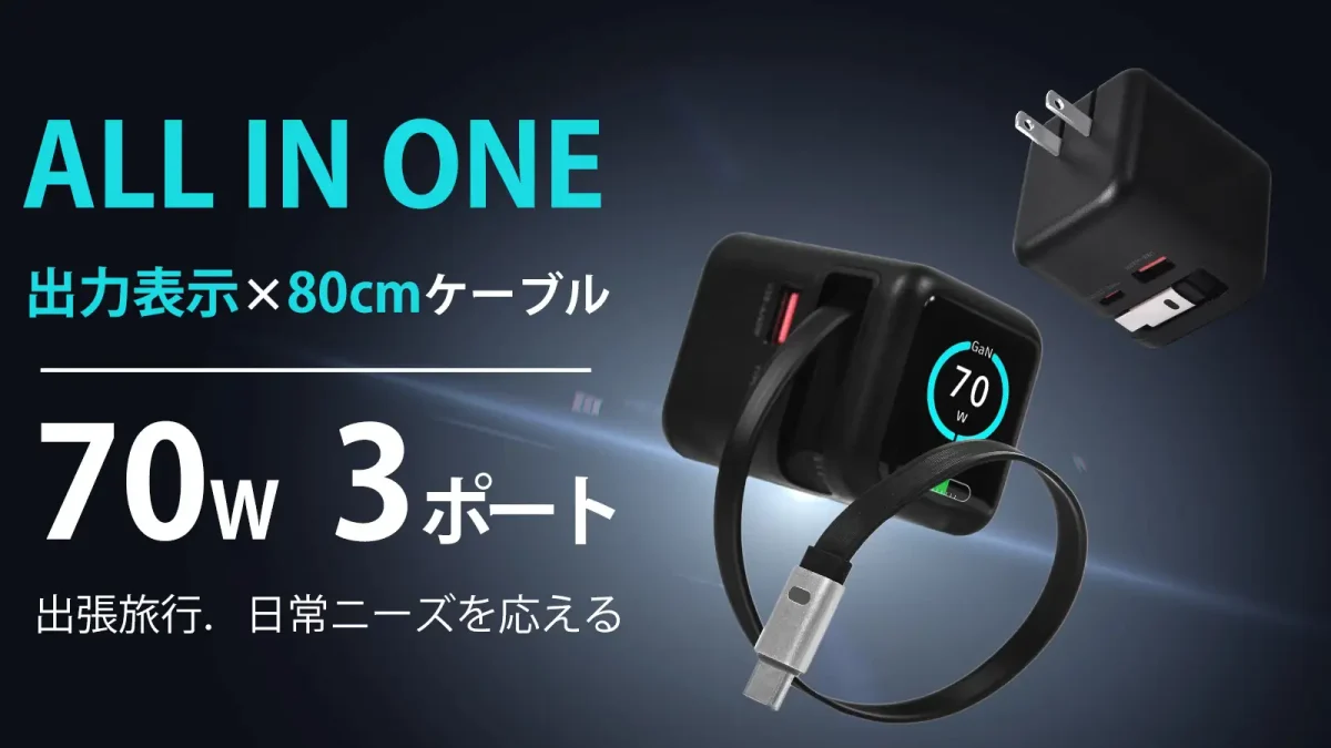 株式会社SUNONEは、出力表示付き、ケーブル内蔵のGaN 70W急速充電器をクラウドファンディングに出品しています。