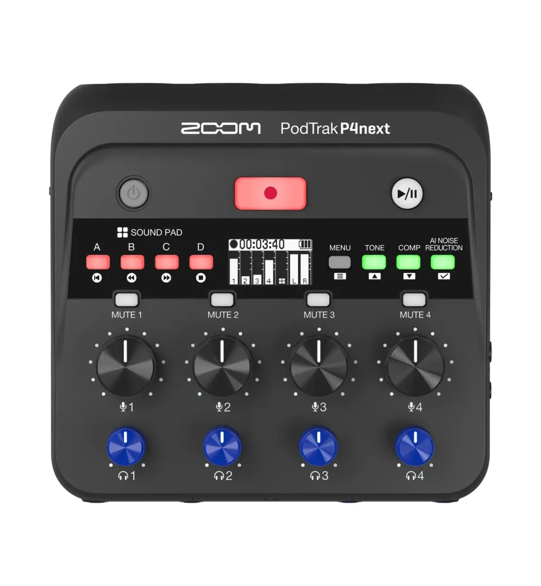 株式会社ズームは、4つのXLRマイク入力と4つのヘッドフォン出力を備え、4人分の音声のマルチトラック録音とライブ配信が行えるポッドキャスト用レコーダー『PodTrak P4next』を発売しています。