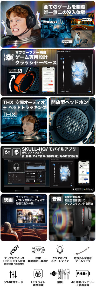 Skullcandyは、Skullcandy特許技術による体感重低音と、THX®認証の立体音響が融合した4Dヘッドホン「Crusher PLYR 720」をクラウドファンディングに出品しています。