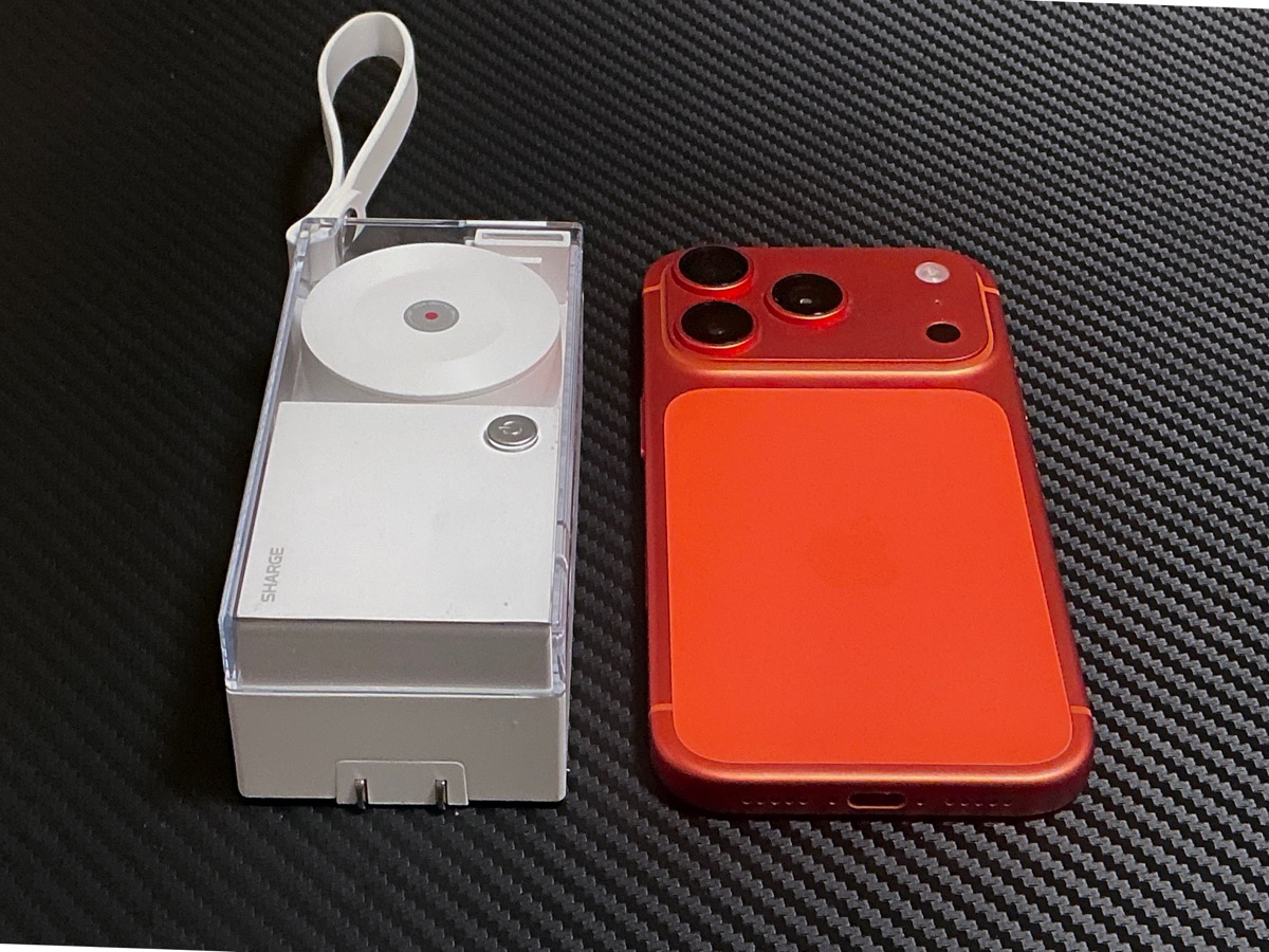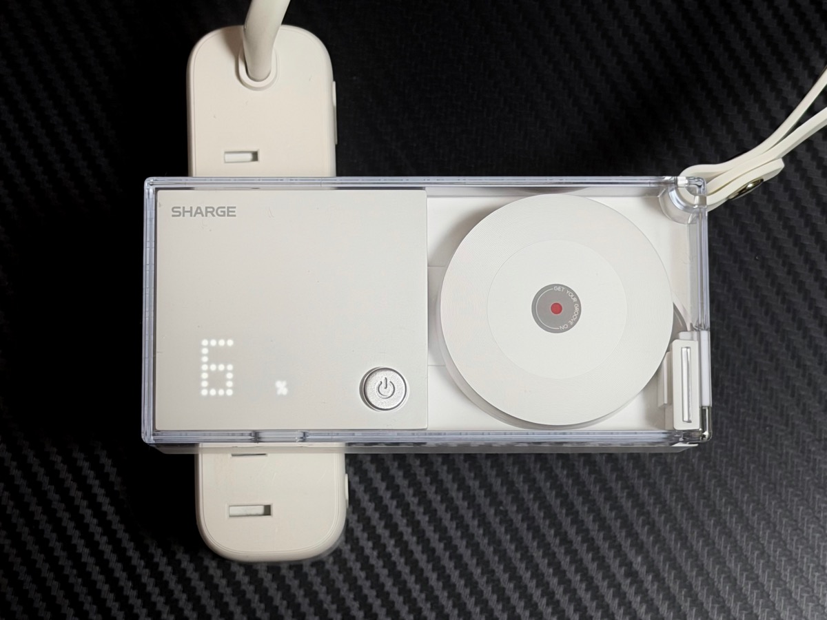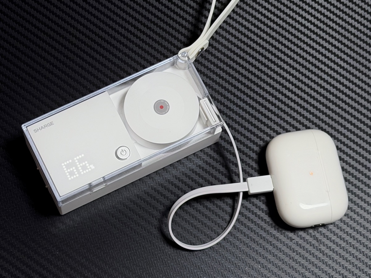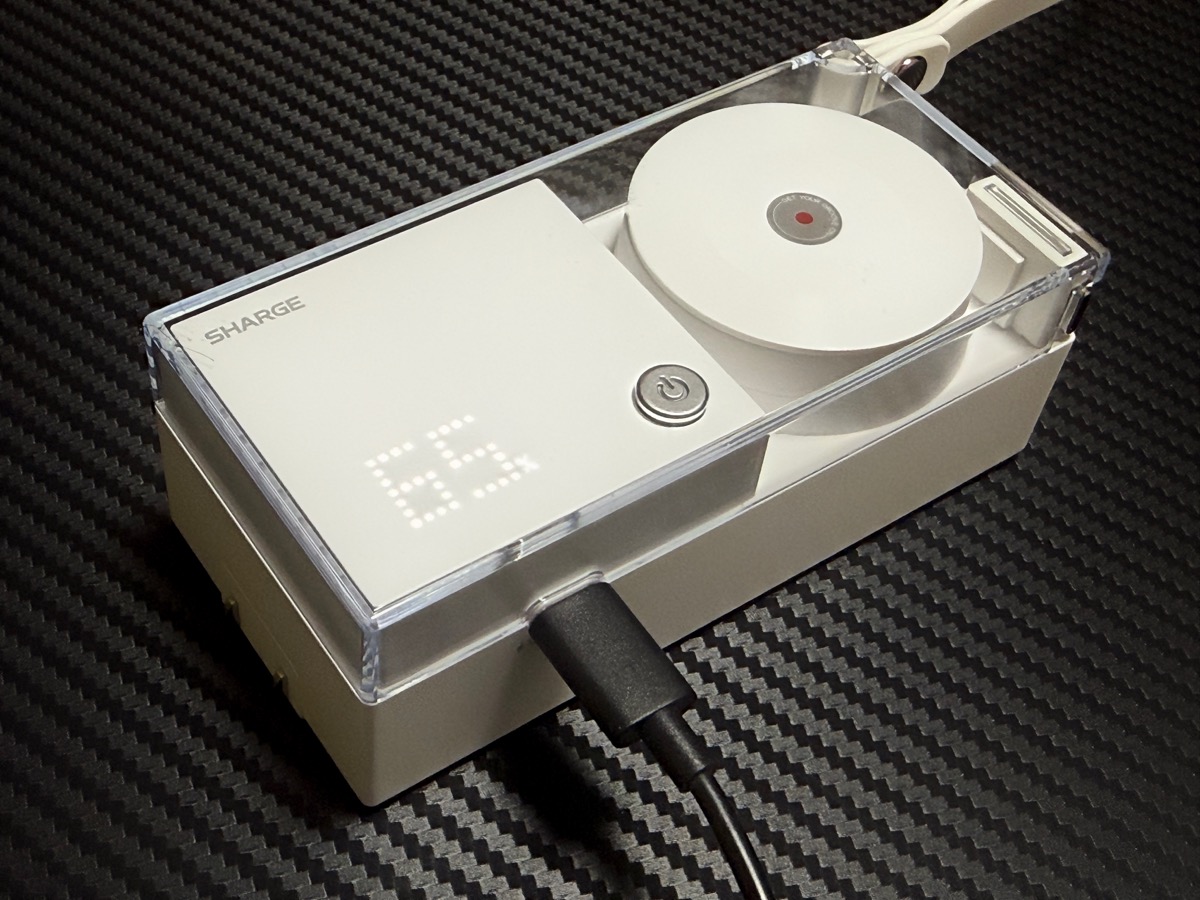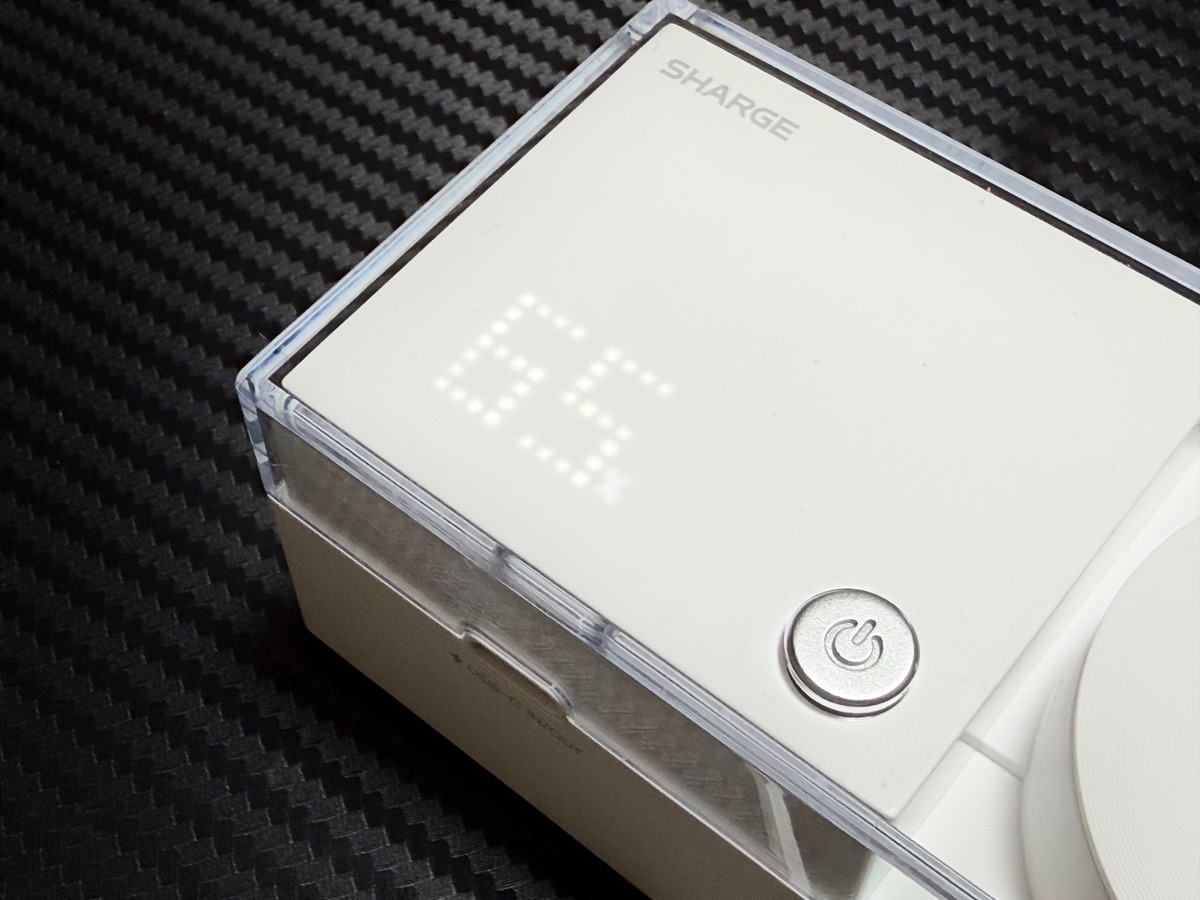 また、iPhoneなどへの充電中にもドットLEDは点灯します。筐体デザインとマッチして、デザイン性を感じる表示です。コンセントに差し込んでおける点を思うと、据え置き時計の機能を搭載していても良かったかもしれません。(※SHARGE製の他のモバイルバッテリーにデジタル時計機能を搭載したモデルがあります。)