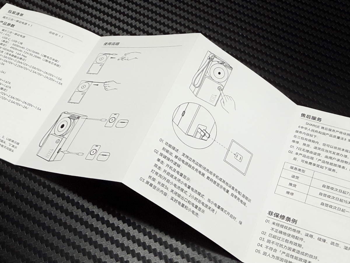 出力は巻き取り式内蔵USB-CケーブルとUSB-Cポートを搭載しており、2台の機器を同時充電できます。