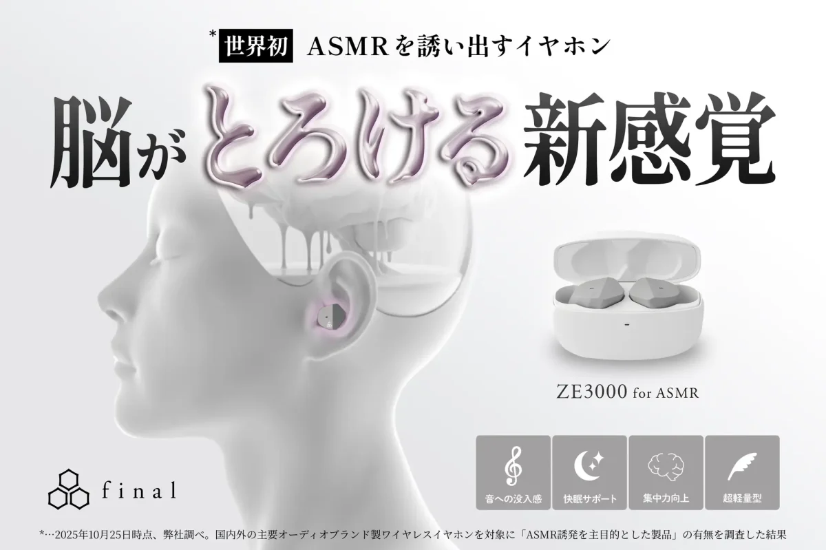 株式会社finalは、世界初のASMR特化ワイヤレスイヤホン「ZE3000 for ASMR」をクラウドファンディングに出品しています。