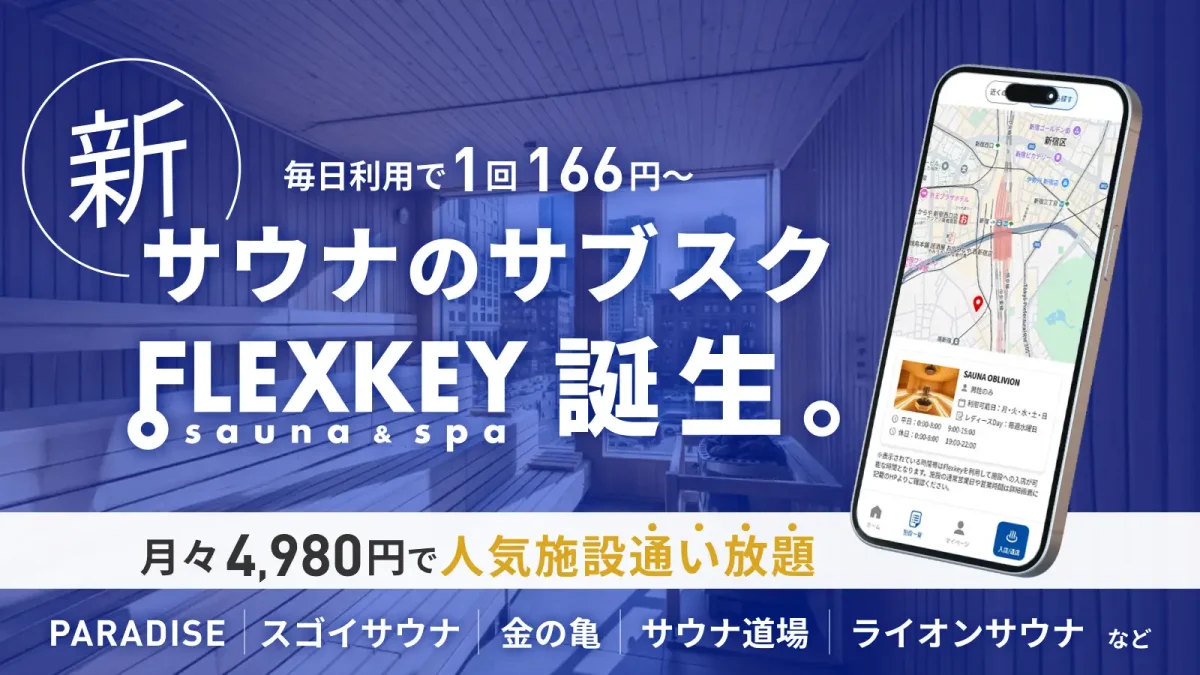 株式会社OPTIMISTは、人気サウナ・温浴施設を月額定額で毎日通い放題にする新サービス「FLEXKEY(フレックスキー)」をクラウドファンディングに出品しています。