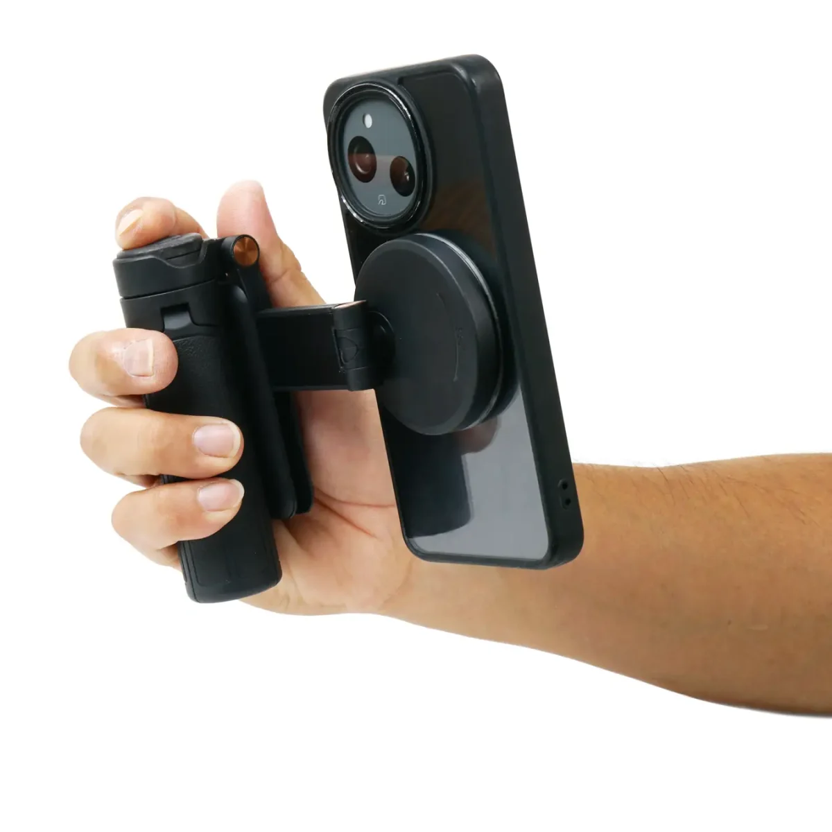 スマートフォン用のグリップ、テーブル三脚として、マルチに使えます。マグネットホルダーにより、iPhone12以降のMagSafeに対応した機種、Pixel 10以降のPixelsnapに対応した機種をワンタッチで取り付け可能。