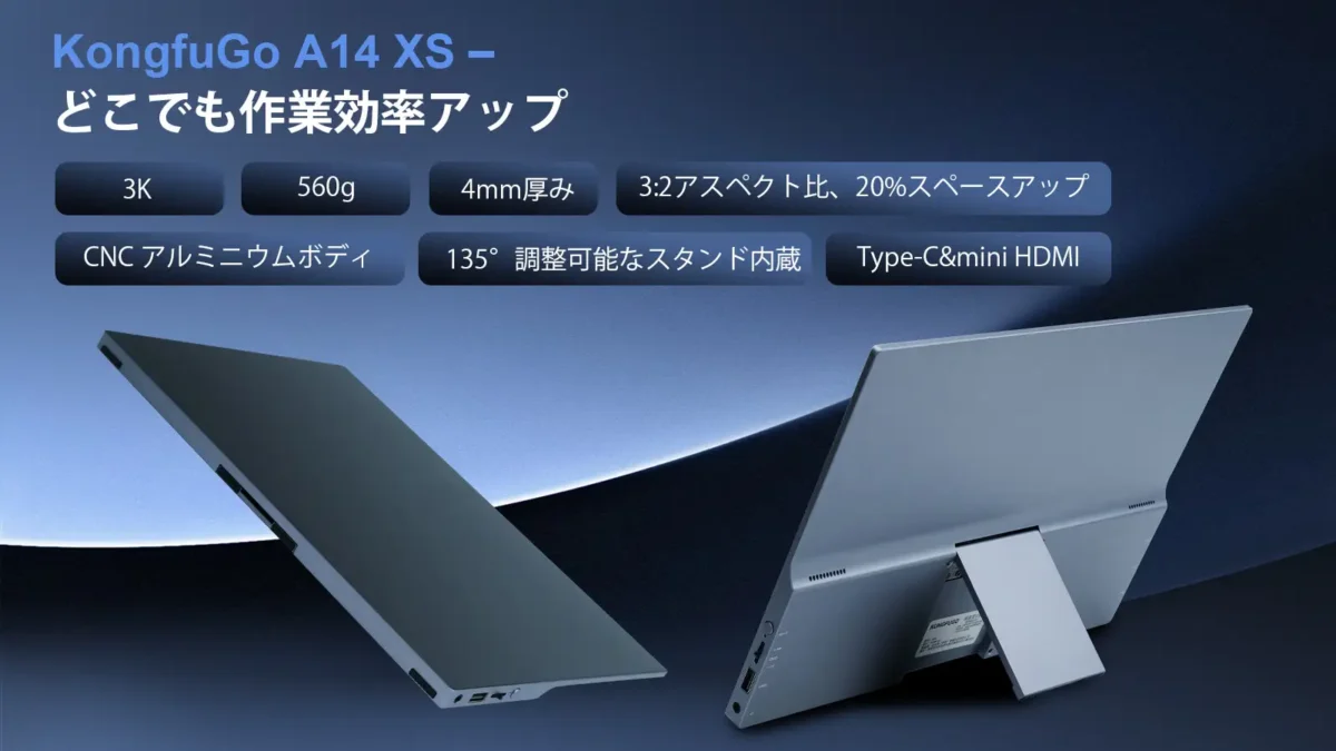 Healthy Option株式会社は、超軽量かつ高性能ポータブルモニター「KungfuGo A14 XS」をクラウドファンディングに出品しています。