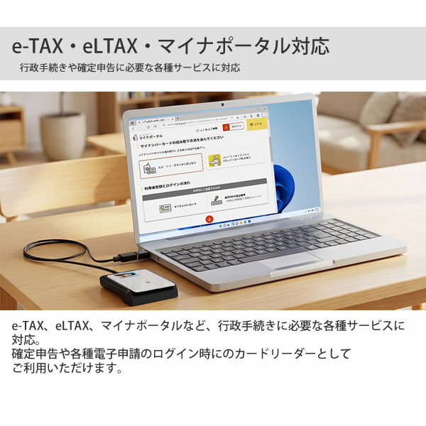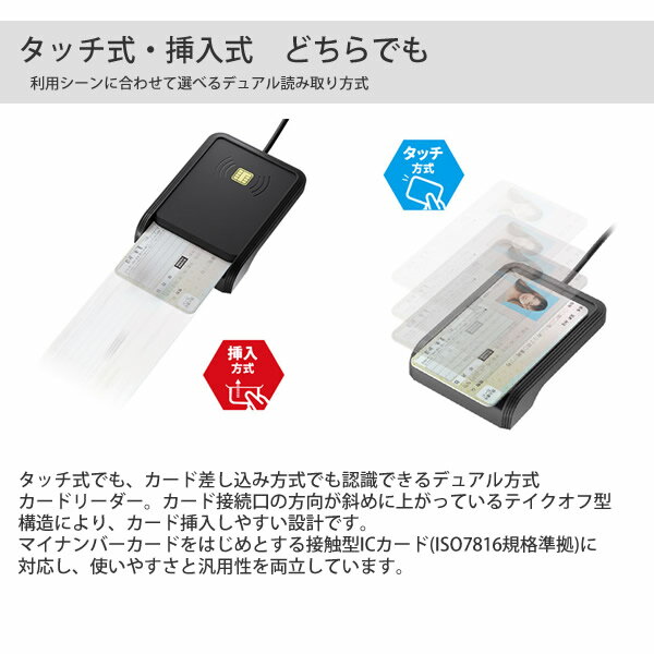 タッチ式と挿入式の両方式に対応し、マイナンバーカード・e-Tax・eLTAX・マイナポータルなどの各種電子申請サービスに最適。付属の変換アダプタを使うことで接続端子を気にせず利用可能で、WindowsやMacOSなど幅広いOSにも対応。コンパクトで軽量設計により、オフィス・在宅・出張先でも便利に使えるカードリーダーです。