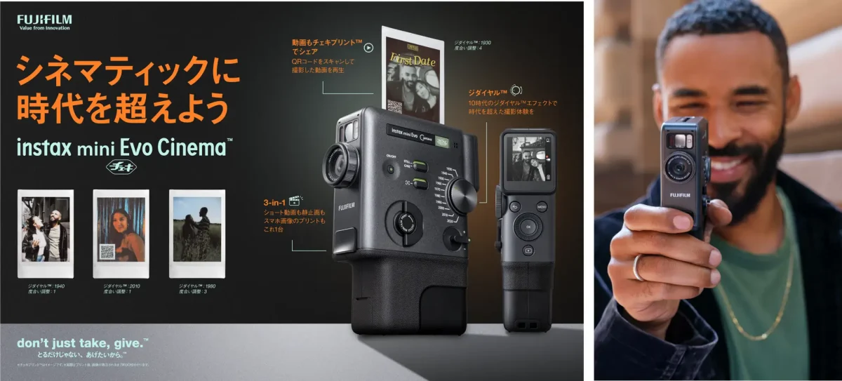 富士フイルム株式会社は、instax™”チェキ”のハイブリッドインスタントカメラ「Evoシリーズ」の新モデルとして「instax(インスタックス) mini(ミニ) Evo(エヴォ) Cinema(シネマ)™」を発売しています。