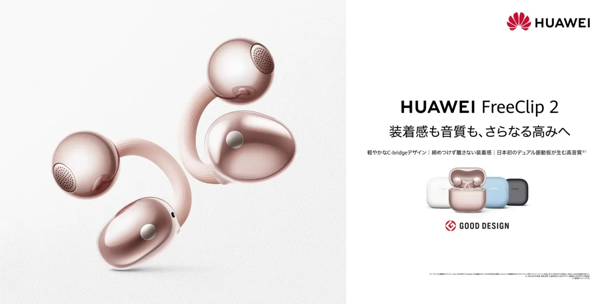 ファーウェイ・ジャパンは、快適な装着感と迫力のある低音がさらに進化したイヤーカフ型イヤホン『HUAWEI FreeClip 2』の新色「ローズゴールド」を発売しています。