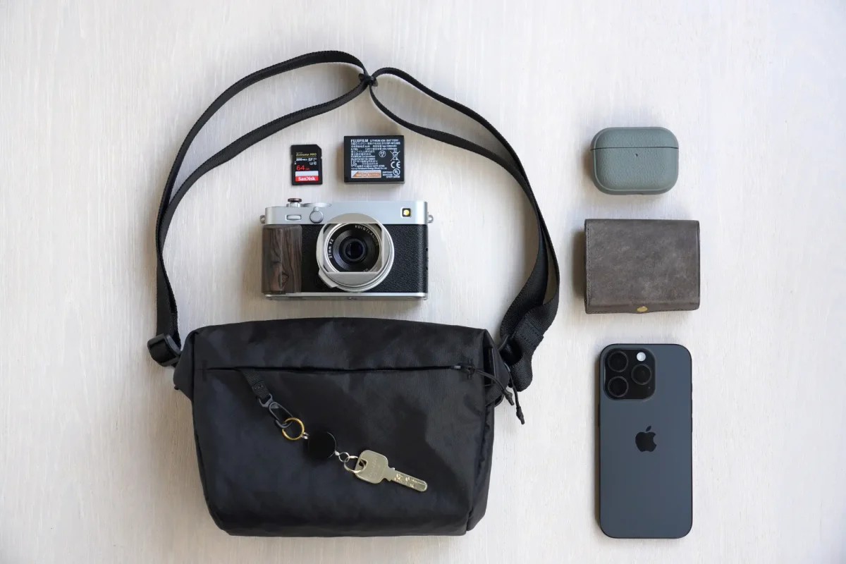 最低限の日用品(例:スマートフォン・ミニ財布・キーケース・ワイヤレスイヤホン)に、カメラ1台を加えて持ち歩くための超コンパクトなカメラバッグです。